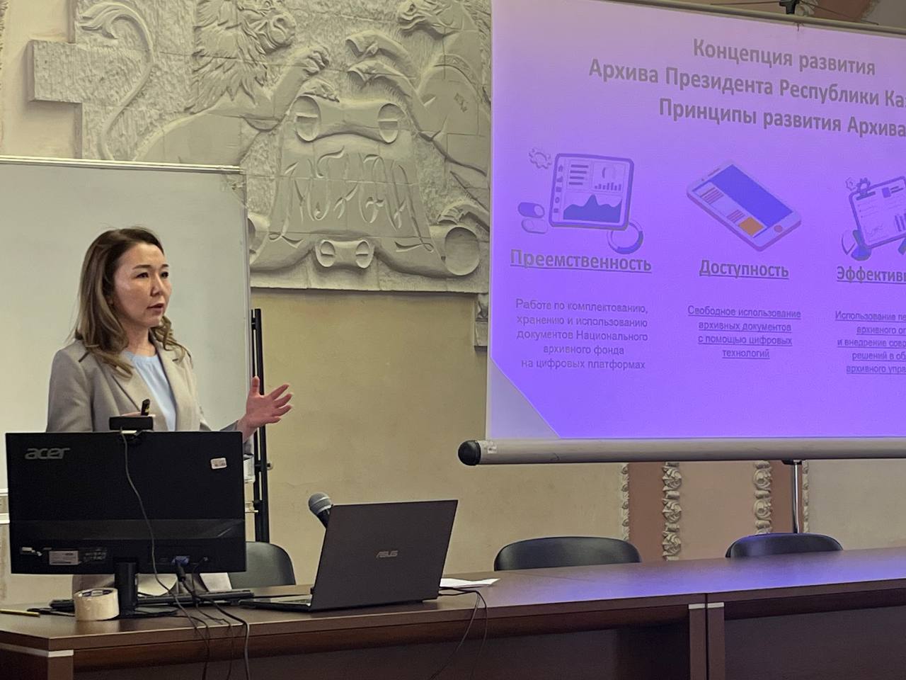 В заключительный день Международной научно-практической конференции «Реальное виртуальное: документальное наследие в цифровую эпоху» директор Архива Президента РК Алия Мустафина выступила с гостевой лекцией в Российском государственном гуманитарном университете (РГГУ).
