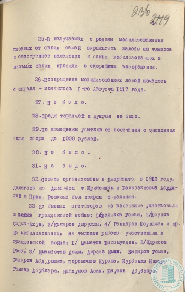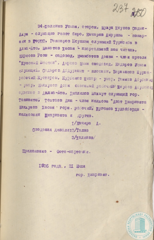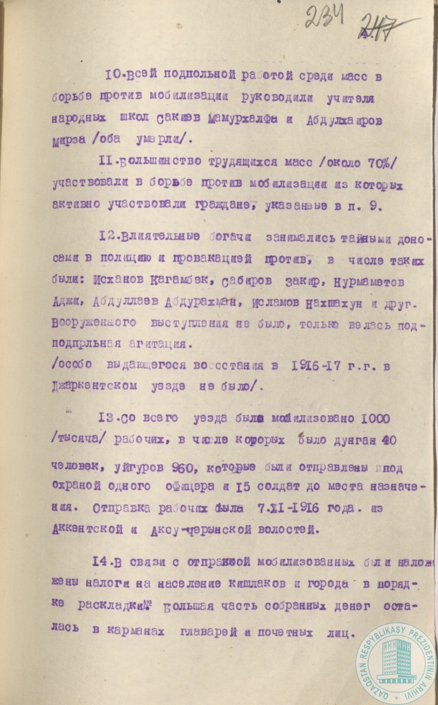 3. Воспоминания А. Качарова, А. Талеева, У. Халикова, мобилизованных на тыловые работы, впоследствии участников национально-освободительного движения 1916 г. в Джаркентском у., г. Джаркент, 21 июля 1936 г.