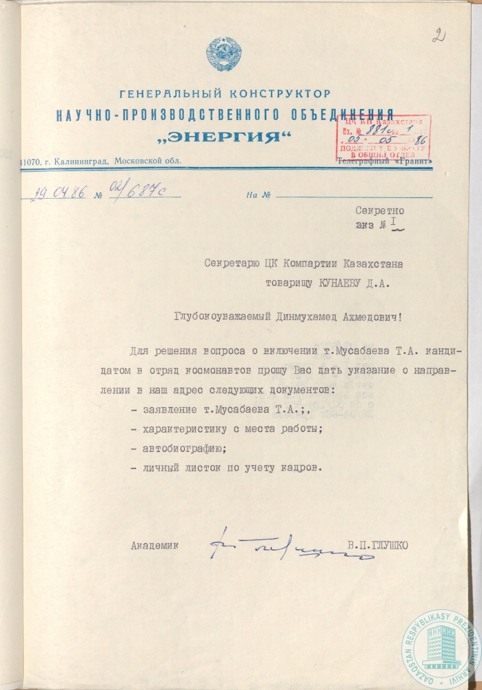 68. Письмо секретаря ЦК Компартии Казахстана Д. Кунаева директору НПО «Энергия» академику В. Глушко о включении Т. Мусабаева в отряд по подготовке космонавтов, г. Алма-Ата, 9 апреля 1986 г.