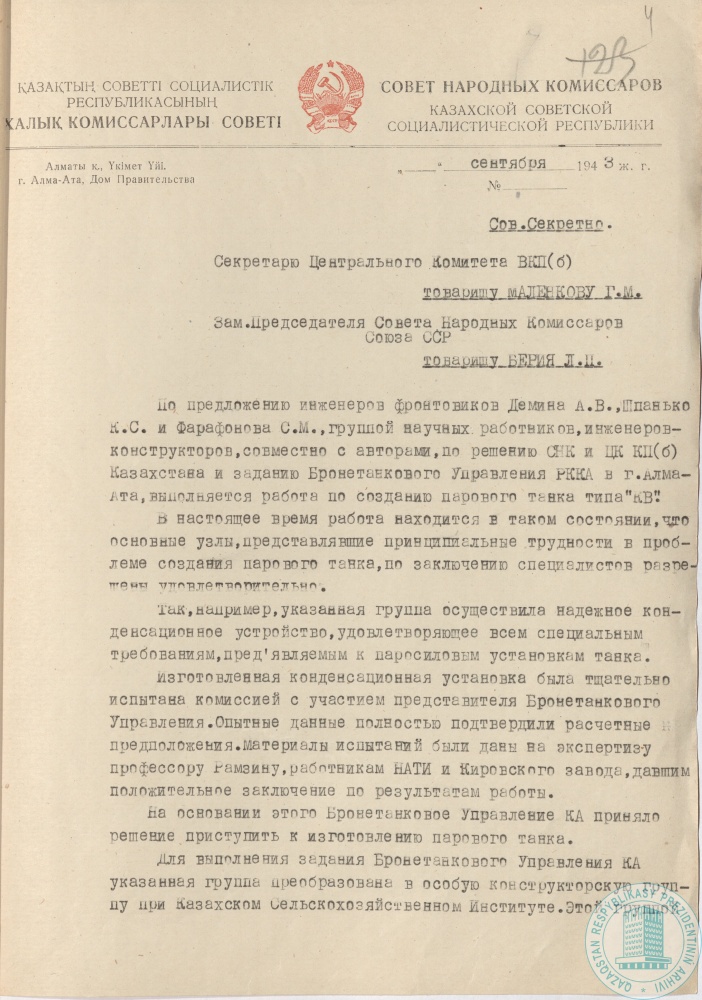 61. Письмо зампред Совнаркома КазССР А. Заговельева секретарю ЦК ВКП (б) Г. Маленкову, зампред Совнаркома СССР Л. Берии о разработке парового танка типа «КВ» на базе Казахского сельскохозяйственного института, г. Алма-Ата, сентябрь 1943 г.