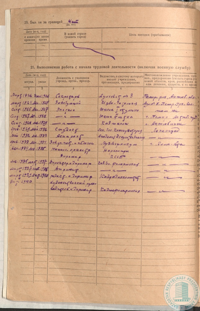 45. Личный листок по учету кадров художественного руководителя и главного дирижера Казахского оркестра музыкальных инструментов им. Курмангазы А. Жубанова, г. Алма-Ата, 27 октября 1941 г.