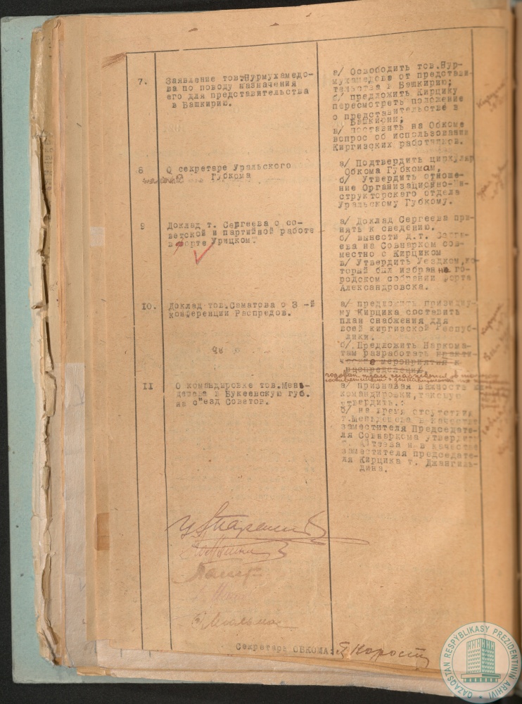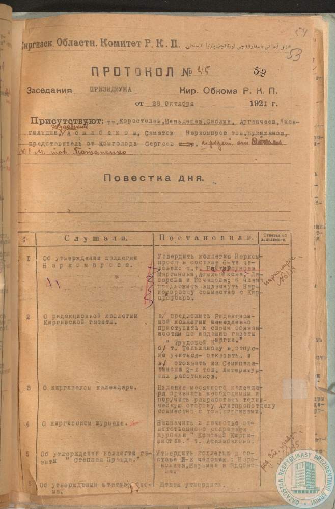 5. Протокол заседания Президиума Киргизского (Казахского) областного комитета РКП № 45 об утверждении коллегии Наркомпроса в составе: А. Байтурсынова, Мартынова, А. Асылбекова, Лазарева, А. Бочагова, г. Оренбург, 28 октября 1921 г.