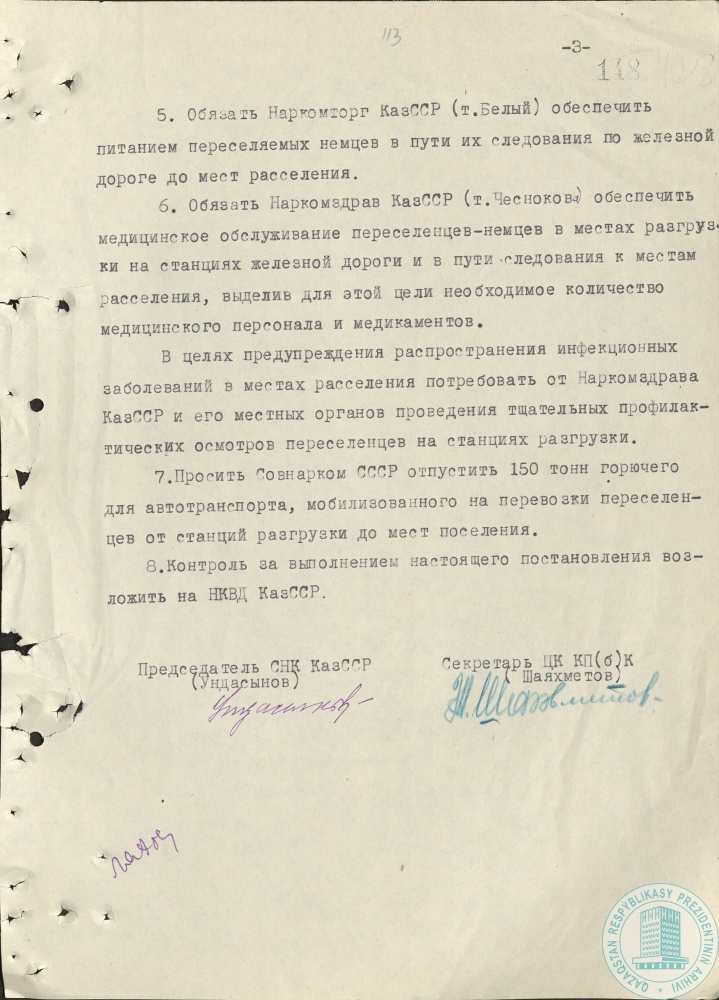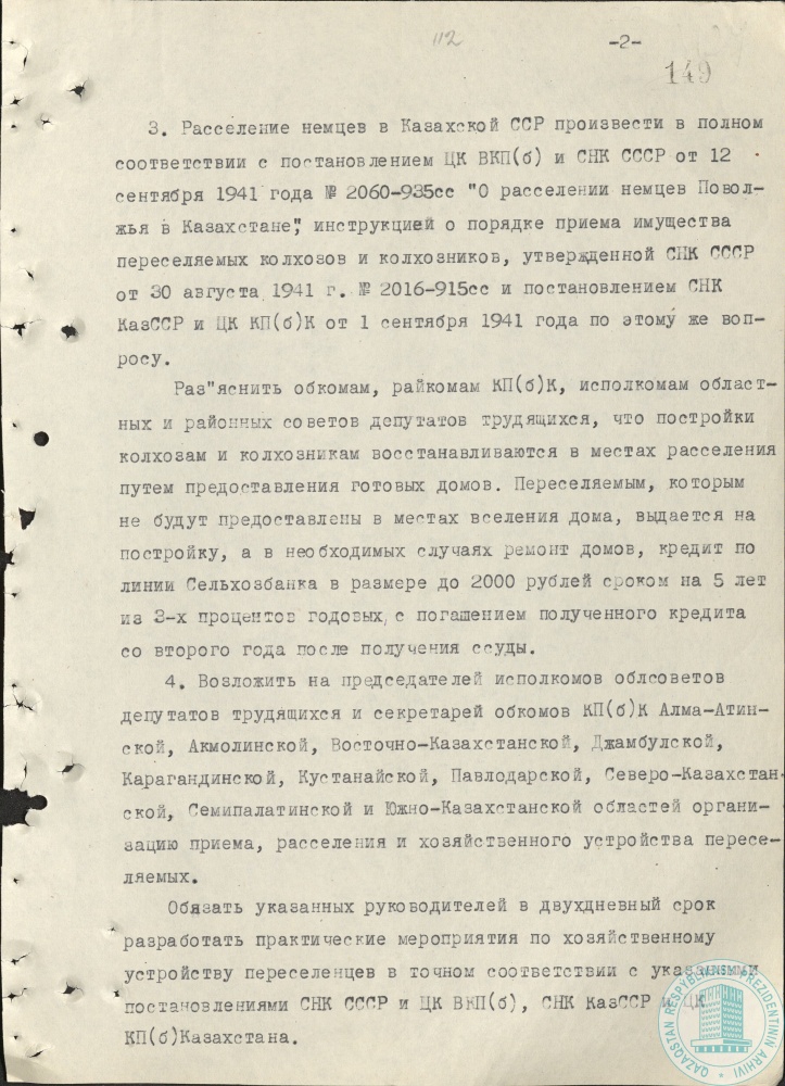 44. Постановление Совнаркома КазССР и ЦК КП (б) Казахстана «О мероприятиях по реализации постановления Государственного Комитета Обороны от 8 октября 1941 г. № 744-сс «О переселении немцев из Грузинской, Азербайджанской и Армянской ССР», г. Алма-Ата, 13 октября 1941 г.