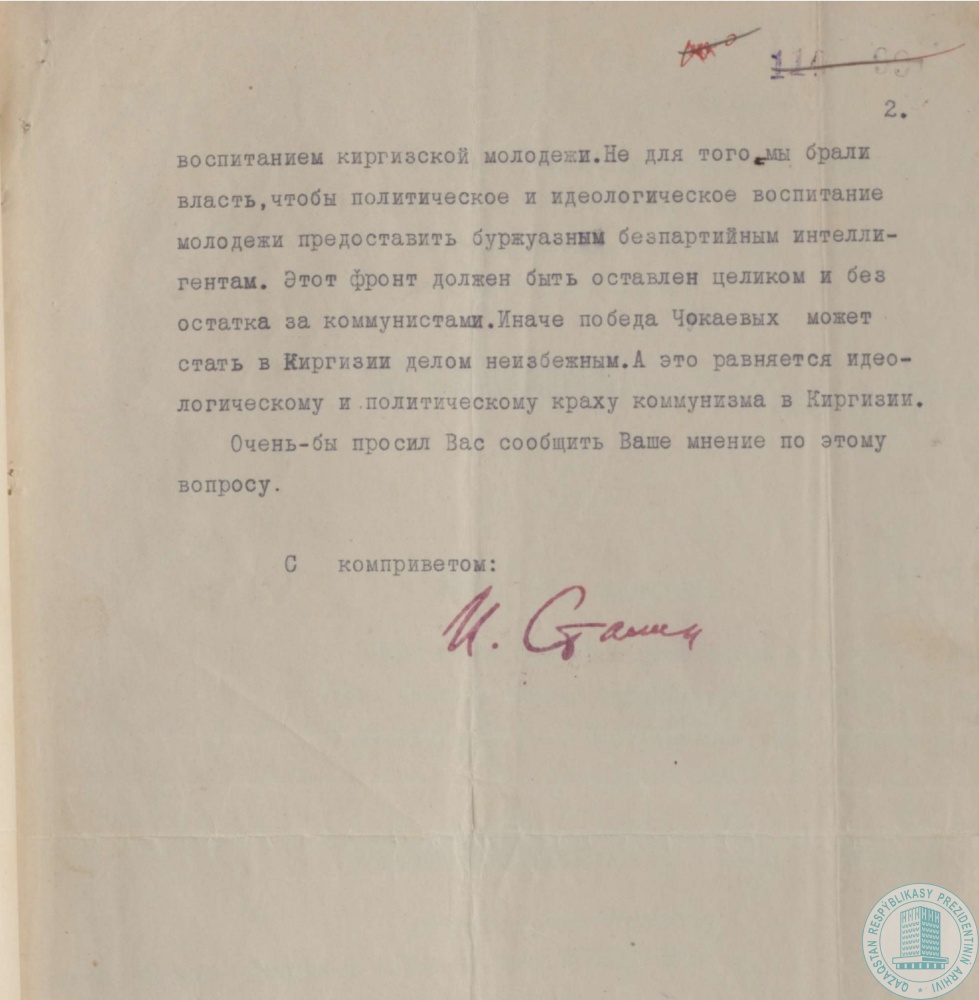 25. Письмо наркома просвещения КазАССР У. Джандосова заведующему агитпропотделом Казкрайкома ВКП (б) С. Сафарбекову об использовании беспартийных деятелей в системе образования республики (М. Ауэзова, А. Байтасова, Г. Беримжанова), г. Алма-Ата, 10 июля 1928 г.