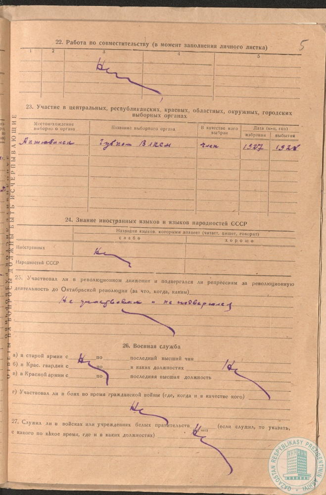 12. Личный листок А. Байтурсынова, председателя Киргизского (Казахского) научно-литературного совета при Наркомпросе, г. Оренбург, 4 июля 1924 г.