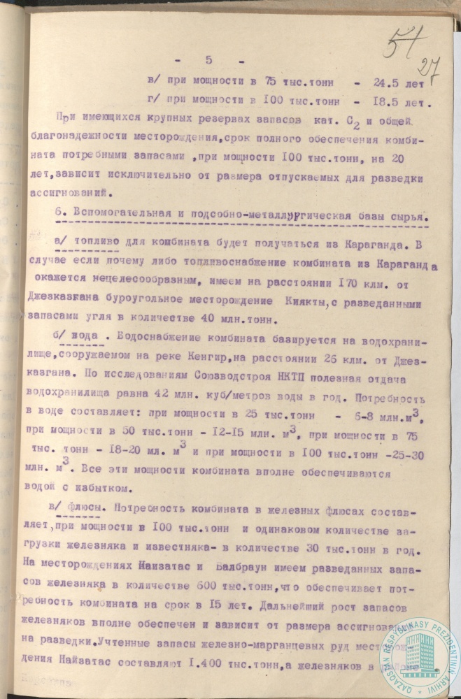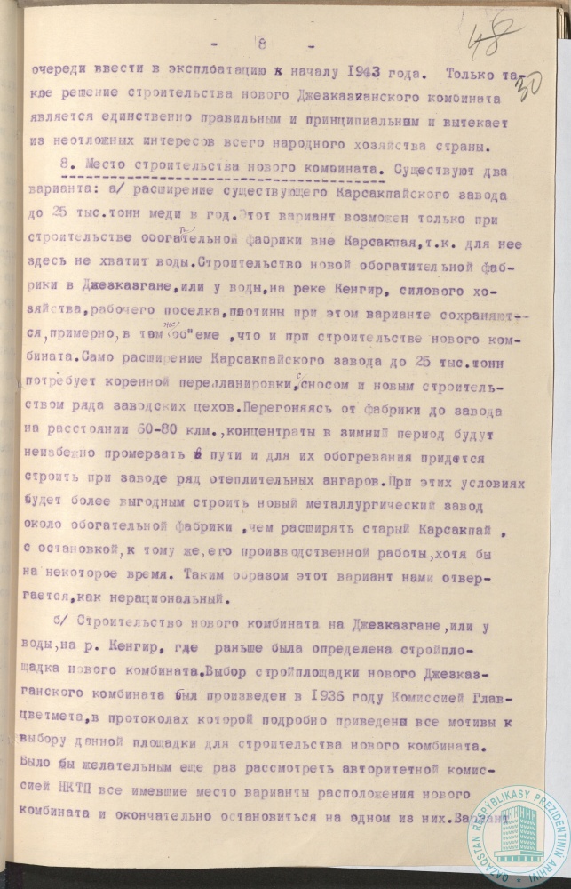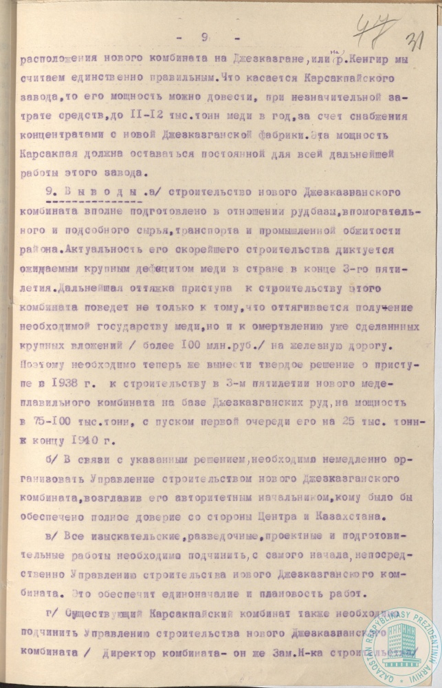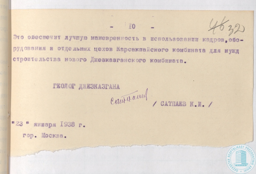 41. Докладная записка геолога К. Сатпаева наркому тяжелой промышленности СССР Л. Кагановичу, секретарю ЦК КП (б) Казахстана Н. Скворцову о строительстве медеплавильного комбината, Джезказган, г. Москва, 23 января 1938 г.