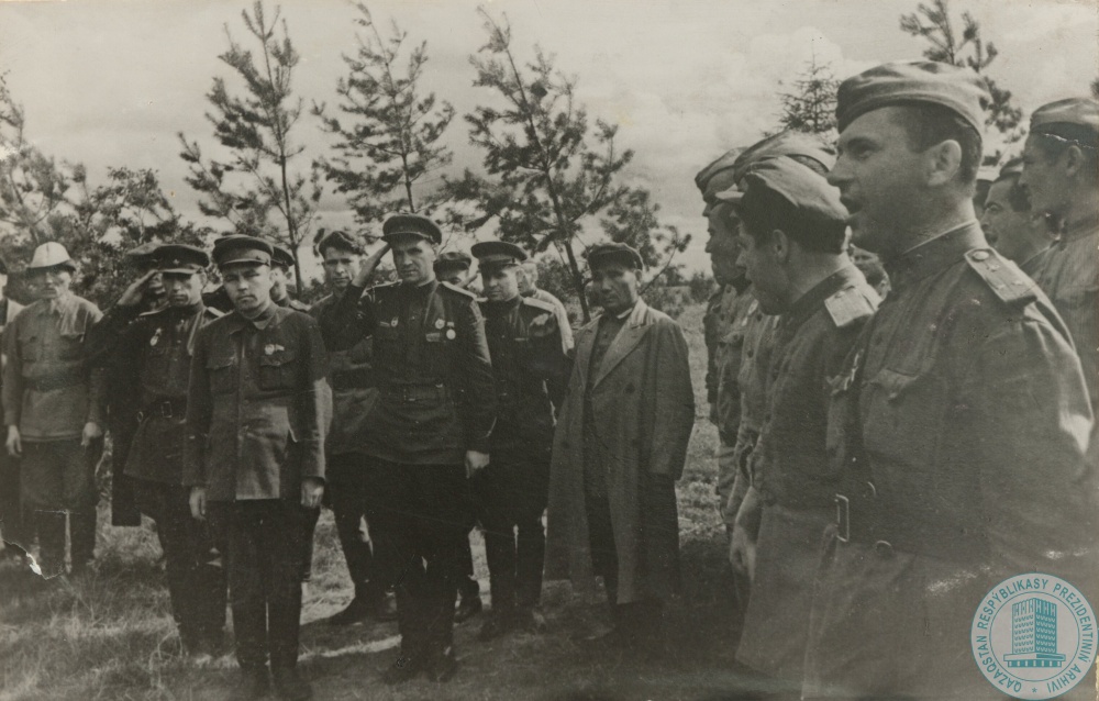 57. Встреча делегации Казахстана во главе с секретарем ЦК КП (б) М. Абдыкалыковым с командиром 8-й Гвардейской стрелковой дивизии им. И. Панфилова генерал-майором С. Чернюговым, действующая армия, март 1943 г.