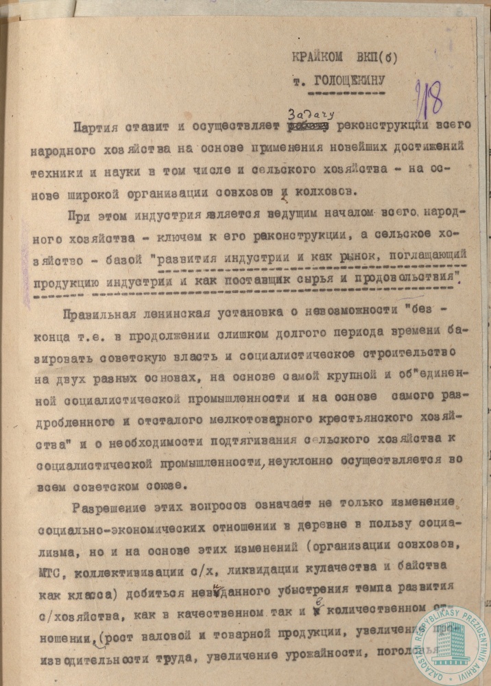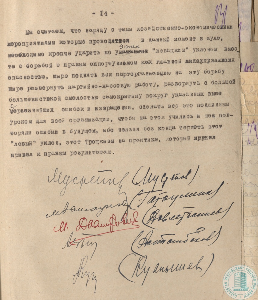 32. «Письмо пяти» Г. Мусрепова, М. Гатауллина, М. Давлетгалиева, А. Алтынбекова, К. Куанышева первому секретарю Казкрайкома ВКП (б) Ф. Голощекину об ошибках и извращении реконструкции народного хозяйства Казахстана, г. Алма-Ата, 4 июля 1932 г.