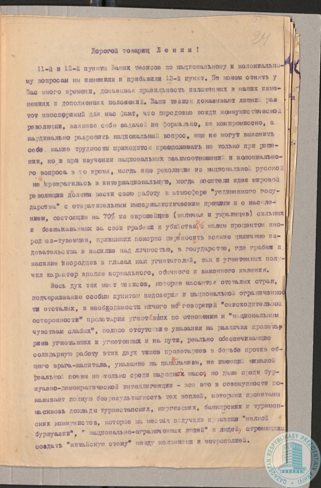 15. Записка Т. Рыскулова, А. Ходжанова, А. Байтурсынова, З. Валидова, Х. Юмагулова председателю Совнаркома РСФСР В. Ленину к тезисам по национальному и колониальному вопросам на 2-м Конгрессе 3-го Коминтерна, г. Москва, 16 июня 1920 г.