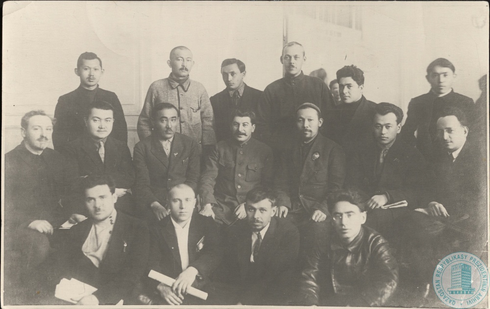 22. Генеральный секретарь ЦК ВКП (б) И. Сталин среди делегатов Казахстана на XIV съезде ВКП (б). 2-й ряд (слева направо): 1. Ф. Голощекин, 2. С. Садвакасов, 3. Ж. Мынбаев, 4. И. Сталин, 5. [И. Курамысов], 6. Н. Нурмаков, г. Москва, 18–31 декабря 1925 г.
