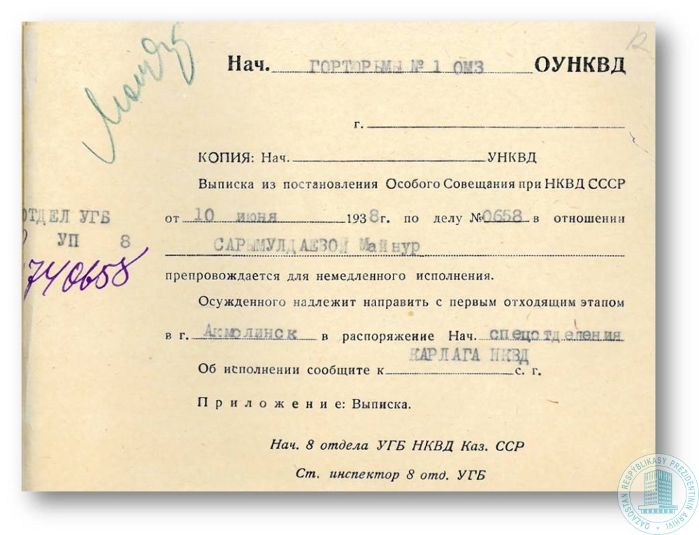 Распоряжение 8-го отдела УГБ НКВД КазССР начальнику Акмолинской городской тюрьмы об отправке осужденной Б. Сыргабековой первым этапом в лагерь.