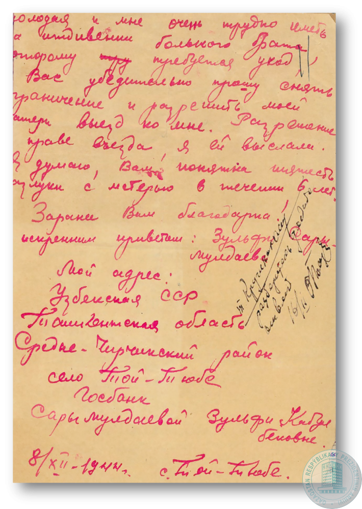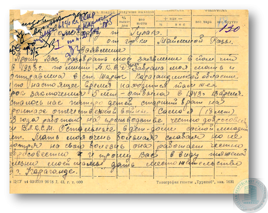 Заявление З. Сарымолдаевой начальнику Карлага НКВД КазССР о снятии ограничения свободы с её матери М. Сарымолдаевой и разрешении на выезд.