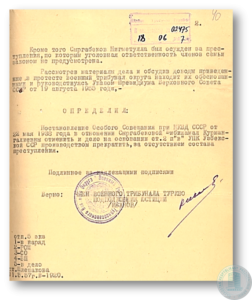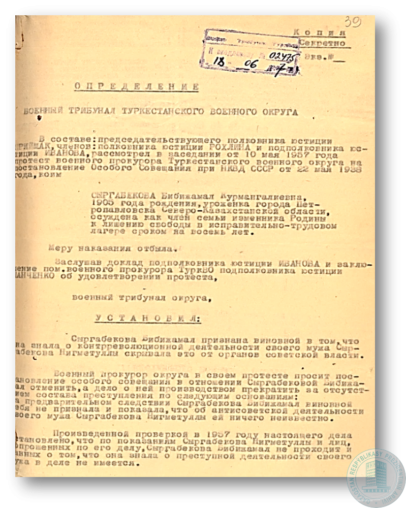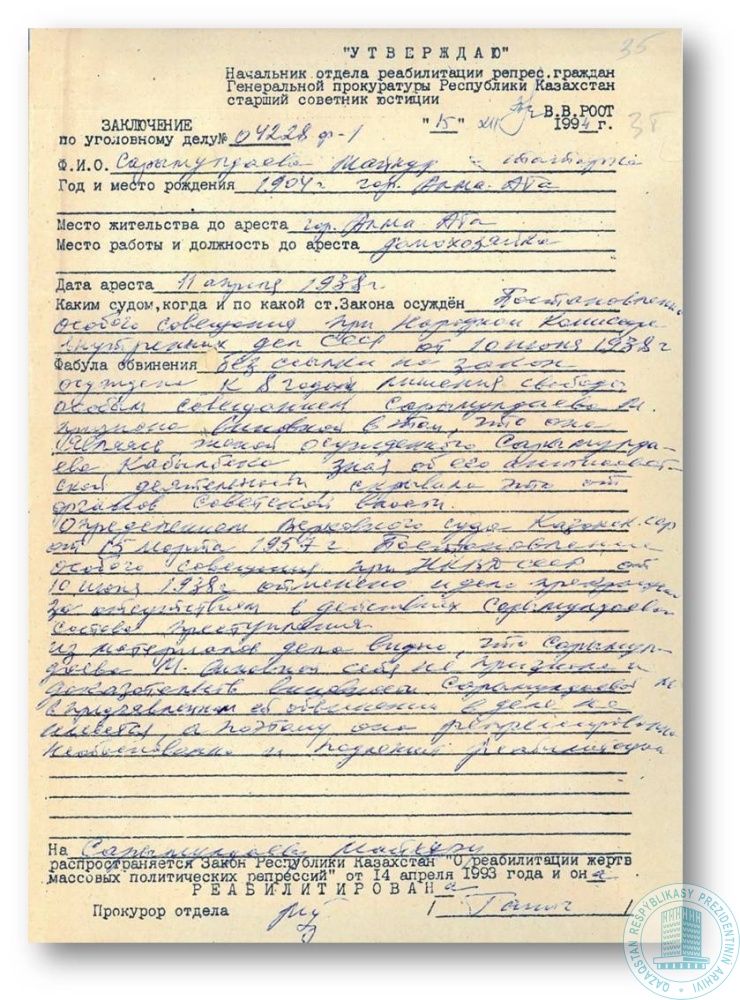 Заключение Генеральной прокуратуры Республики Казахстан о реабилитации М. Сарымолдаевой.