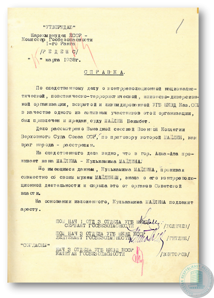 Справка НКВД КазССР об аресте К. Майлиной.