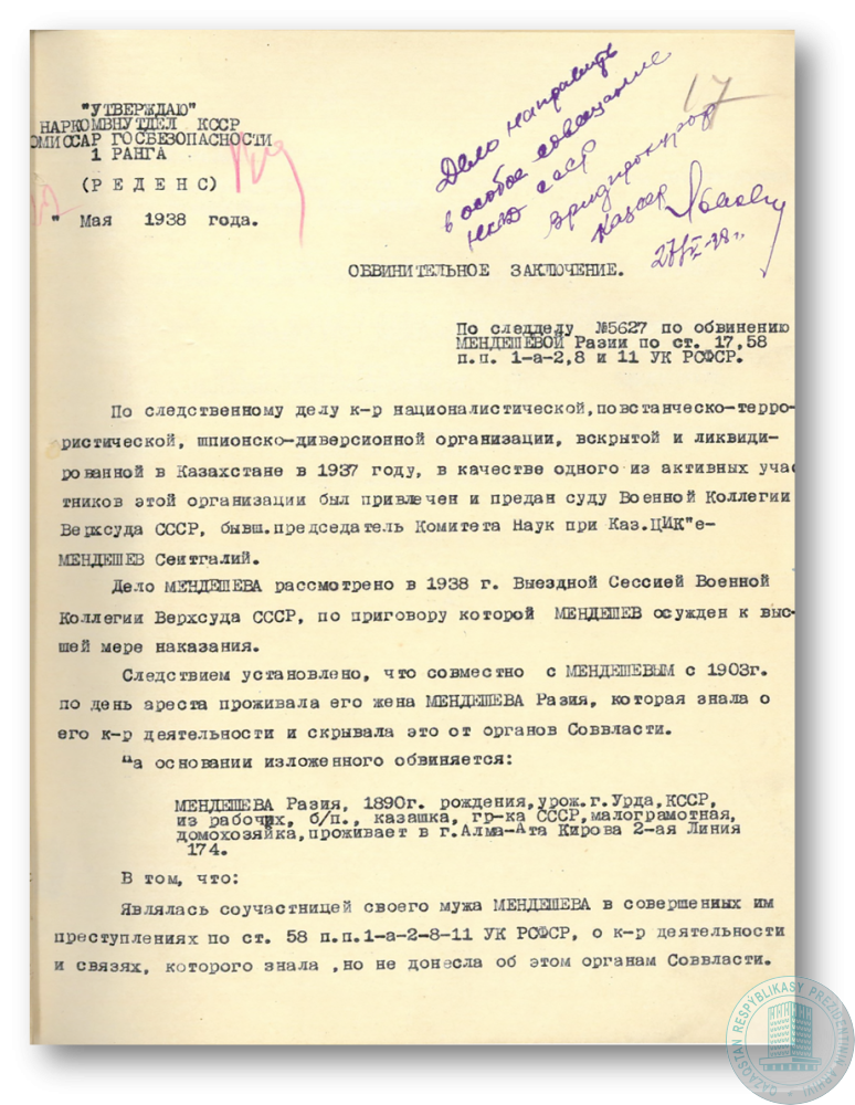 Обвинительное заключение НКВД КазССР по делу Р. Мендешевой о заведомом сокрытии от органов безопасности сведений об антисоветской деятельности мужа С. Мендешева.