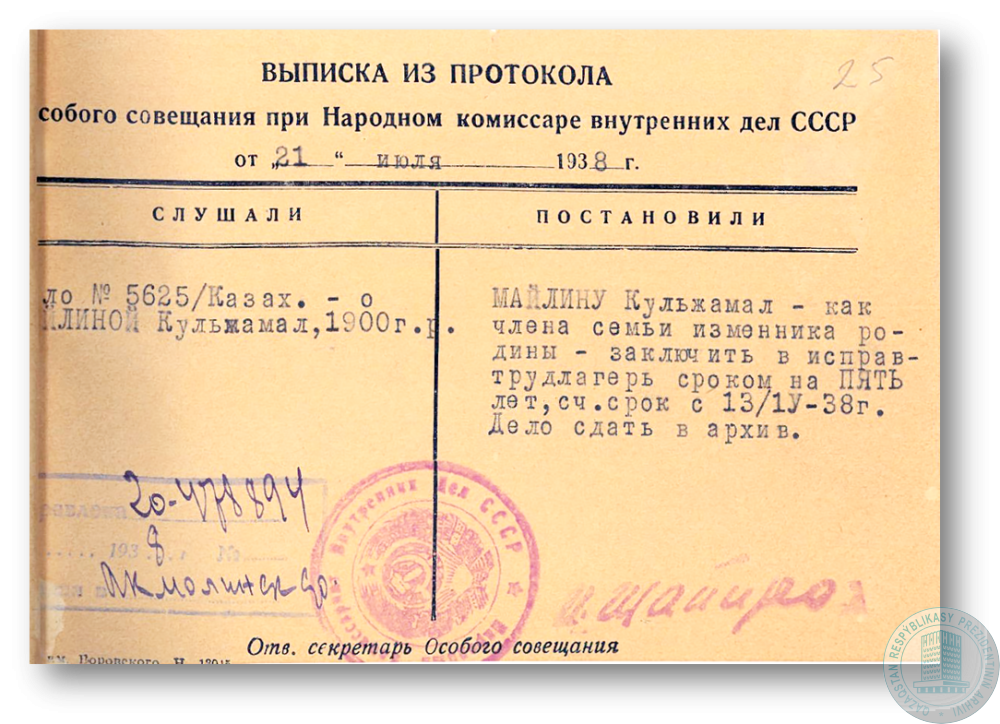 Выписка из протокола Особого совещания при НКВД СССР об обсуждении М. Сарымолдаевой к 8 годам ИТЛ как члена семьи, «изменника Родины».
