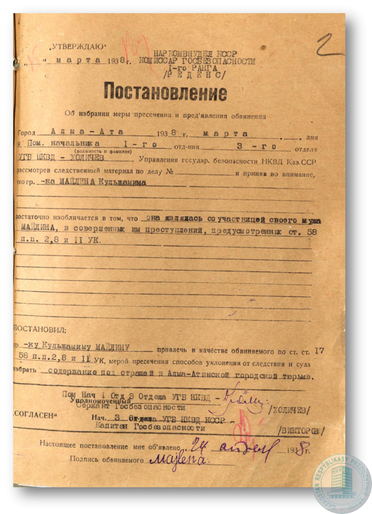 Постановление НКВД КазССР об избрании меры пресечения и предъявления обвинения К. Майлиной.