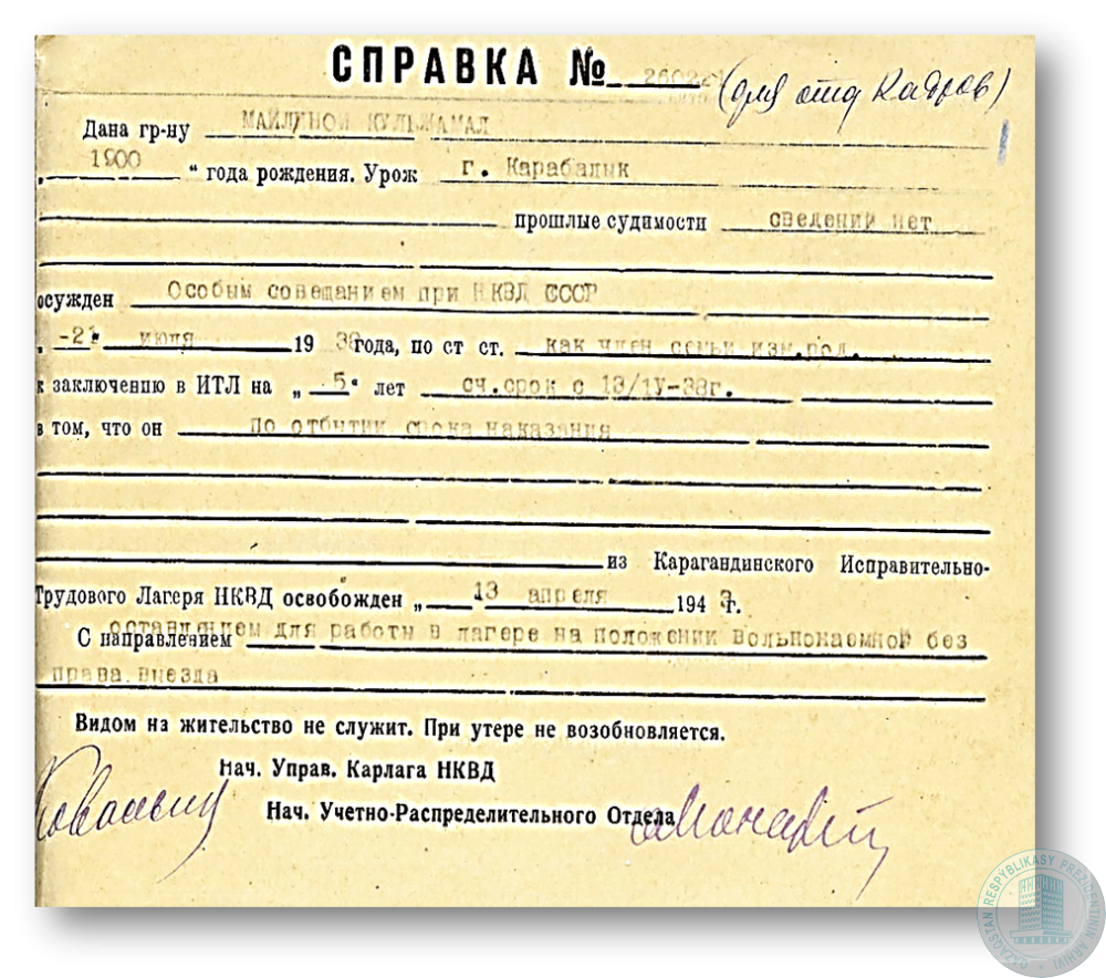 Справка НКВД КазССР на семью «изменника Родины» У. Кулымбетова, осужденного к расстрелу решением Выездной Сессии Военной Коллегии Верховного Суда СССР.