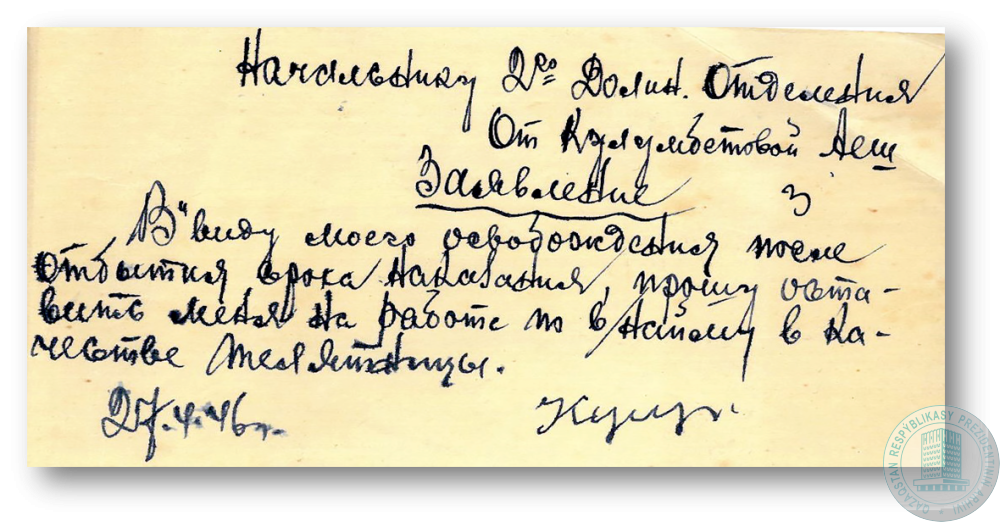 Заявление А. Кулымбетовой начальнику 2-го Долинского отделения о приеме на работу по найму на работу в качестве телятницы после отбытия срока наказания.