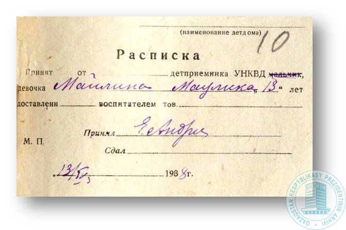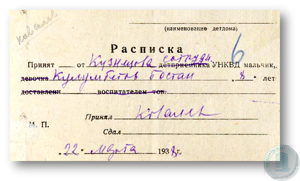 Расписка о принятии в детский дом Бостана Кулымбетова.
