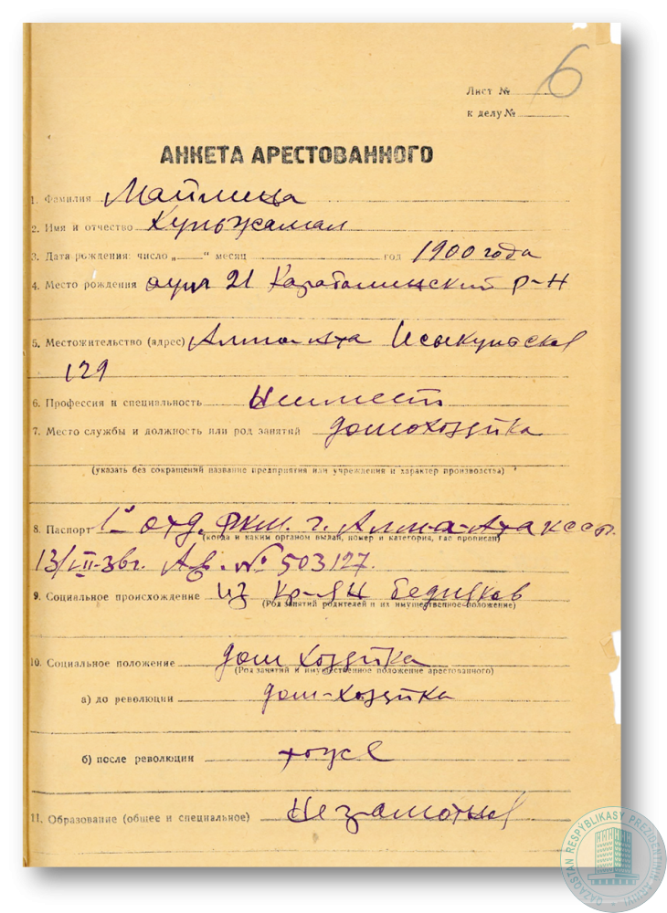 Анкета арестованного М. Сарымолдаевой.