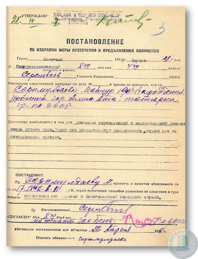 Постановление НКВД КазССР об избрании меры пересечения и предъяления обвинения М. Сарымолдаевой.