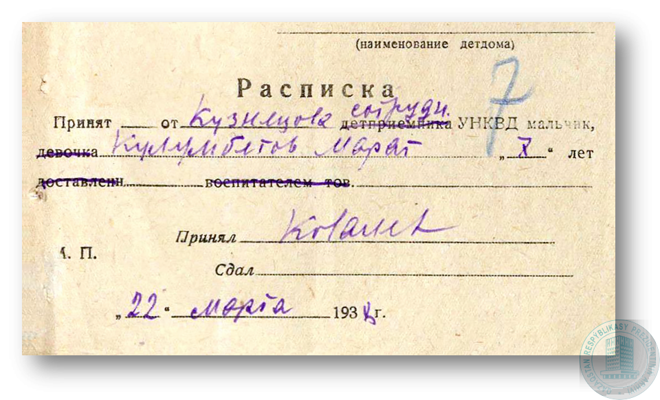 Расписка о принятии в детский дом Марата Кулымбетова.