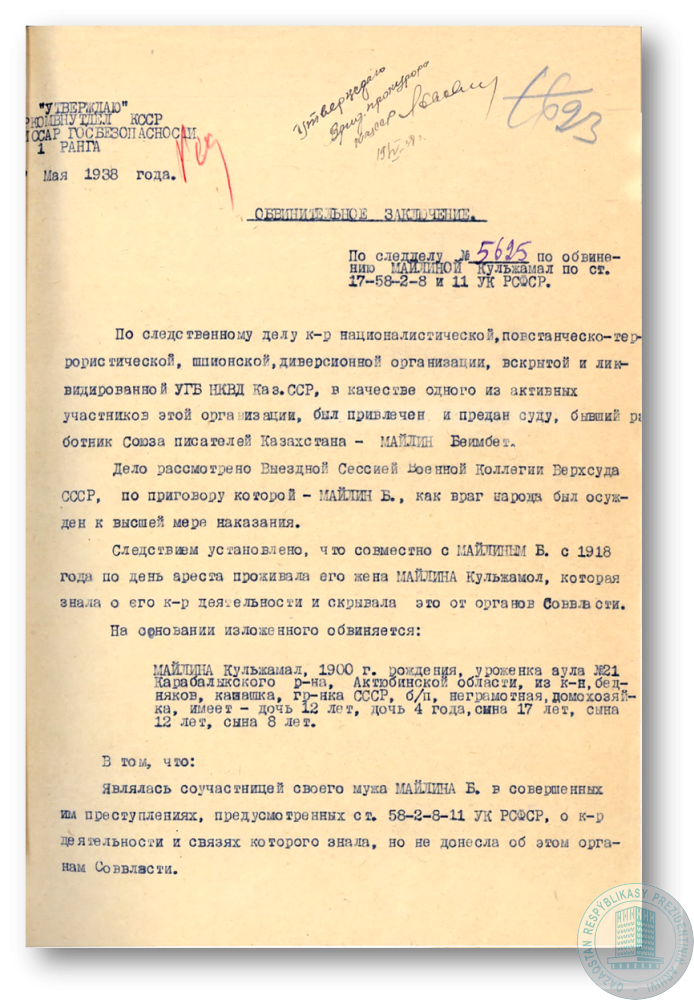 Обвинительное заключение НКВД КазССР по делу А. Кулымбетовой @о заведомом сокрытии от органов безопасности сведений об антисоветской деятельности мужа У. Кулымбетова.