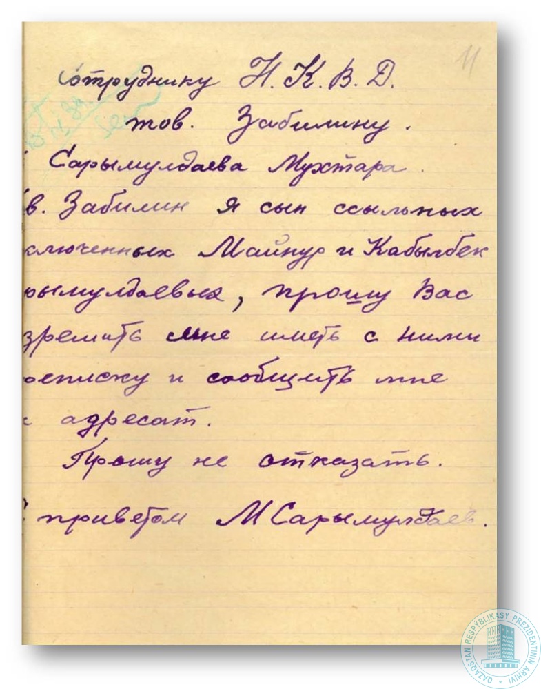 Письмо М. Сарымолдаева сотруднику НКВД [?] А. Забилину с просьбой о переписке с задержанными родителями.