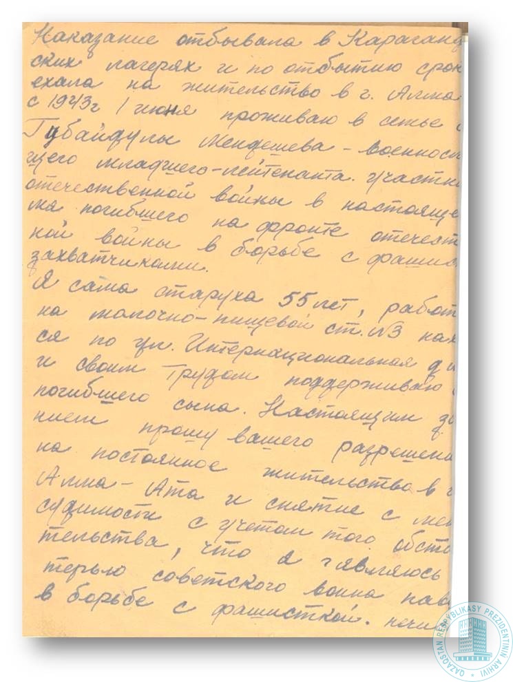 Заявление Р. Мендешевой Президиуму Верховного Совета КазССР о снятии судимости и предоставлении права на постоянное жительство в г. Алма-Ате.